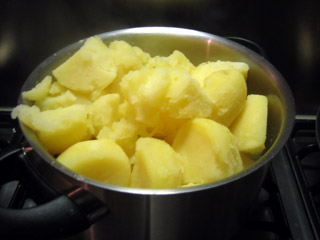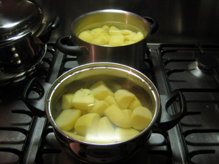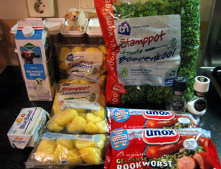 2. Piepers jassen. Daar heeft u uiteraard een hekel aan, dus u koopt voorgeschilde "stamppot" aardappelen. Of u gaat daadwerkelijk schillen, maar koop dan grote kruimige aardappelen van uitstekende kwaliteit, anders gooit u met wat pech driekwart weg of houdt u onvoldoende over. De juiste verhouding boerenkool/aardappelen zou ergens tussen de 0.5 en 0.25 moeten liggen. De aardappelen gaan in de pan, en aangezien u die waterkoker toch heeft, warm water erbij. De aardappelen moeten zo'n 15 minuten koken, niet veel langer want dan wordt het pap, en dat giet erg lastig af.