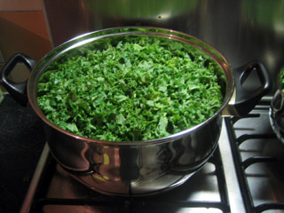 1. Waterkoker vullen met water en boerenkool in de pan. Helaas past dat niet, en als u eenmaal klaar bent zult u zich afvragen waar het allemaal gebleven is. Dus u vult de pan voor zover mogelijk. Dan 2 liter kokend water erbij, et voilà, er is pardoes ruimte. Afvullen met de rest van de boerenkool en nog een liter kokend water. Had u dit met koud water gedaan, dan had u een extra pan nodig gehad. Wat ook prima is, maar het levert meer afwas op. Deksel schuin erop, en op het vuur. Dit moet zo 25-30 minuten koken in totaal, maar als het nog niet eerder gevroren heeft kan het zijn dat de boerenkool nog taai is. Dan eventueel 10 minuten langer door laten garen.
