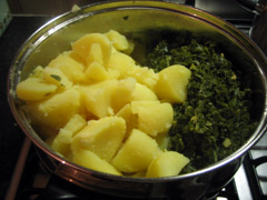 4. Met een vork kunt u controleren of de aardappelen gaar zijn. Hebt u inmiddels een gele pap, dan bent u te laat. Giet de aardappelen af. Als uw timing goed was, is de boerenkool nu ook gaar, dus u kunt deze ook afgieten. Pas op, met al dat water erin is het nu wel een zware bedoening geworden.