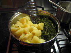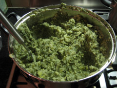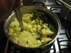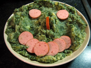 5. Voeg de afgegoten aardappelen bij de afgegoten boerenkool. Esthetisch gezien was andersom mooier geweest, maar u zult merken dat dat niet in de pan past. Voeg een klontje boter en een scheutje melk toe, en wat peper en zout. Neemt u uw stampgerei, en gaat u als een woeste holbewoner te werk. Al vlug maakt het niet bijzonder veel meer uit wat boven en onder is. Blijft u dit doen tot u een enigzins egale groene pulp heeft.