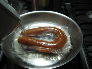6. Haal de rookworst uit het water, haal deze uit de verpakking en snij deze aan. U kunt deze eventueel in schijfjes in de groene massa verstoppen, doch als u deze denkt te gaan opwarmen in de magnetron later, of te gaan invriezen, bewaar de rookworst dan apart.