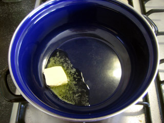 1. Smelt een klont boter in de braadpan. Koekenpan mag ook als deze enorm is, want er moet nogal wat in zometeen.