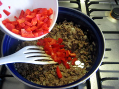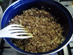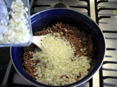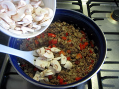 3. Snipper de ui, en voeg deze bij het reeds bruine gehakt. Snij de paprika en champignon en voeg deze toe als de uiensnippers glazig geworden zijn.