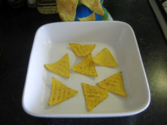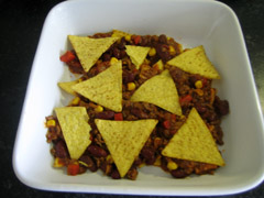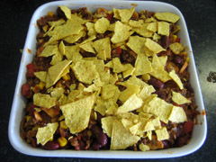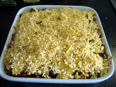 7. Verkruimel wat tortillachips als bovenste laag, en strooi hierover de geraspte kaas. Als de oven op temperatuur is, kan het nu 15 minuten de oven in.