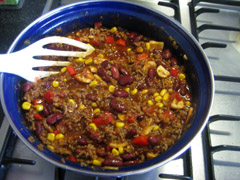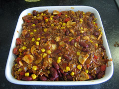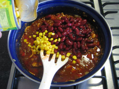 5. Voeg de uitgelekte kidneybonen en maïs toe. Voor een smeuïger resultaat kunt u ook bruine bonen gebruiken. Roert u dit geheel door en laat het nog een minuutje verwarmen. Tevens is dit een goed moment om de oven voor te verwarmen tot 180-200 graden.