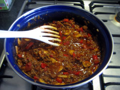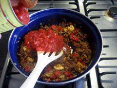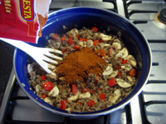 4. Voeg de mexicaanse kruidenmix (maakt niet zoveel uit welke), 100 ml water en de tomatenblokjes toe. Heeft u kruidenmix van een suf merk (Honig of Knorr) dan barst dat al van de tomaat, dus dan kunt u dat achterwege laten. Roert u goed door en brengt u het geheel aan de kook en laat dit 5 minuten pruttelen.