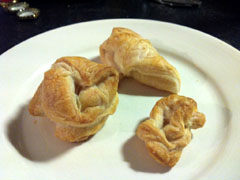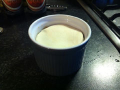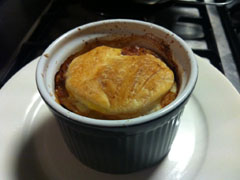 Om het geheel toch iets op te leuken kunt u de brei in een ovenschaaltje doen met twee laagjes bladerdeeg erop. In dit geval een rond ovenschaaltje van de Hema. Dit bakt u in 10 minuten in een oven op 180 graden tot een geinig taartje. Overgebleven randjes kunt u verfrommelen tot mini-croissants om op te peuzelen terwijl u de rest opfleurt door het schaaltje op een groter (leuk: vierkant) bord te zetten en te versieren met eventueel gebakken aadrappeltjes, gekruide frites en/of salade.