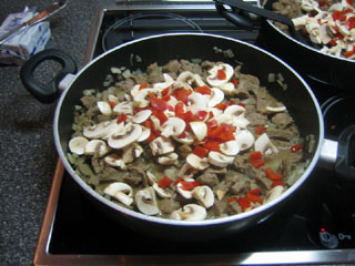 4. Snij ondertussen de champignons en paprika fijn. Als de uiensnippers glazig zijn geworden, voeg dan de champignons en paprikastukjes bij de rest.