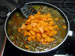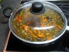 7. Snij wat winterpeen tot kleine stukjes, of schijfjes, of verzint u een leuke vorm. Deze gaan ook in de pan. Voeg een bouillonblokje of 2 toe en doe het deksel op de pan. Af en toe roeren.