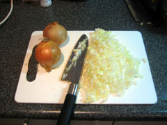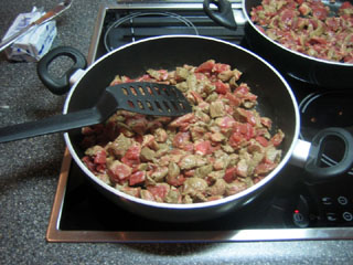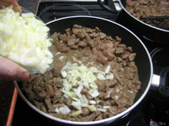 3. SNIJ JE ZO EEN UI? Voeg de gesnipperde uien bij het reeds bruin geworden vlees.